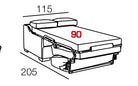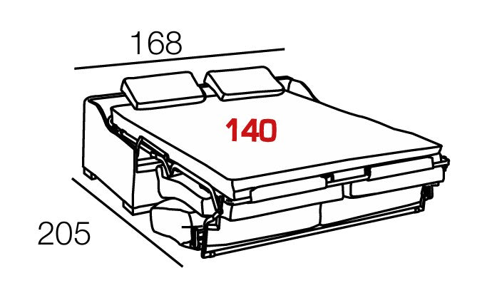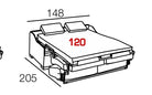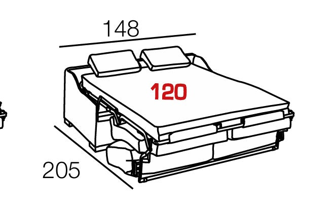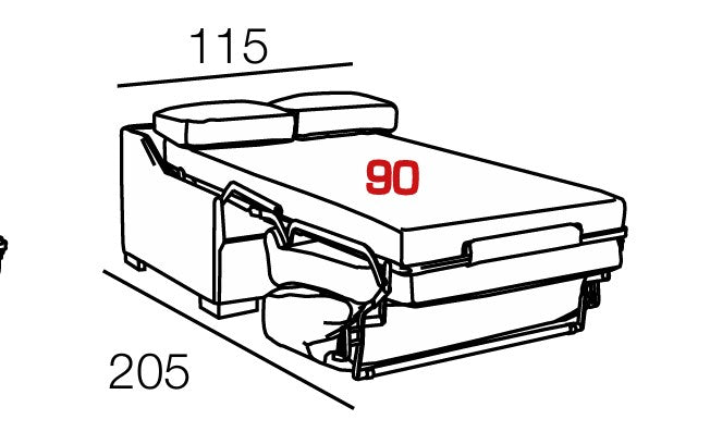 - Couchage : matelas intégré de 90, 120 ou 140 x 190 cm, épaisseur 12 cm, mousse HR 35 kg/m³