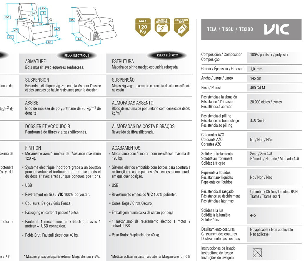 - Mécanisme : système relax motorisé, permettant un ajustement fluide de la position assise à allongée.