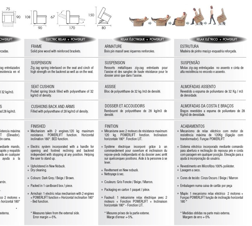 - Mécanisme : système relax relevable motorisé, permettant un ajustement fluide de la position assise à allongée.