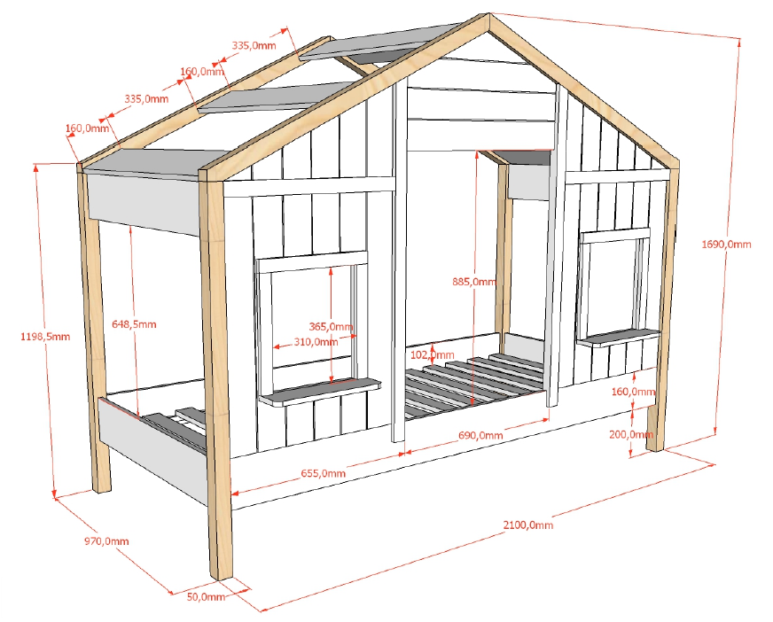 Ce lit maison (90 x 200 cm) de la collection BABS est fabriqué par une grande entreprise Belge spécialisée dans les meubles pour enfants,  à partir d'une combinaison de pin massif et de MDF.