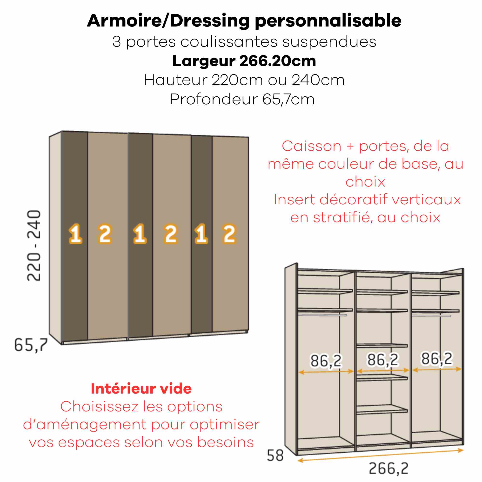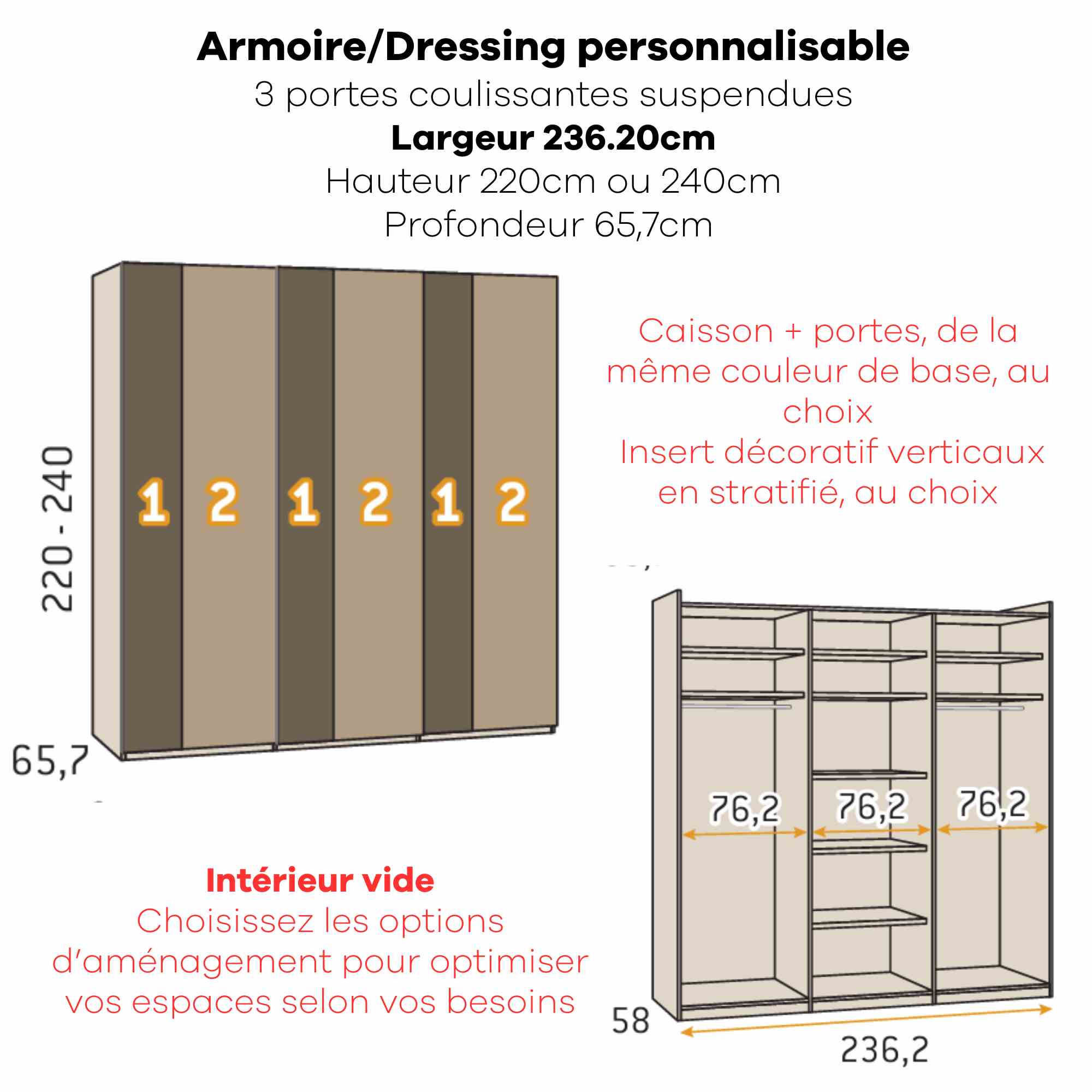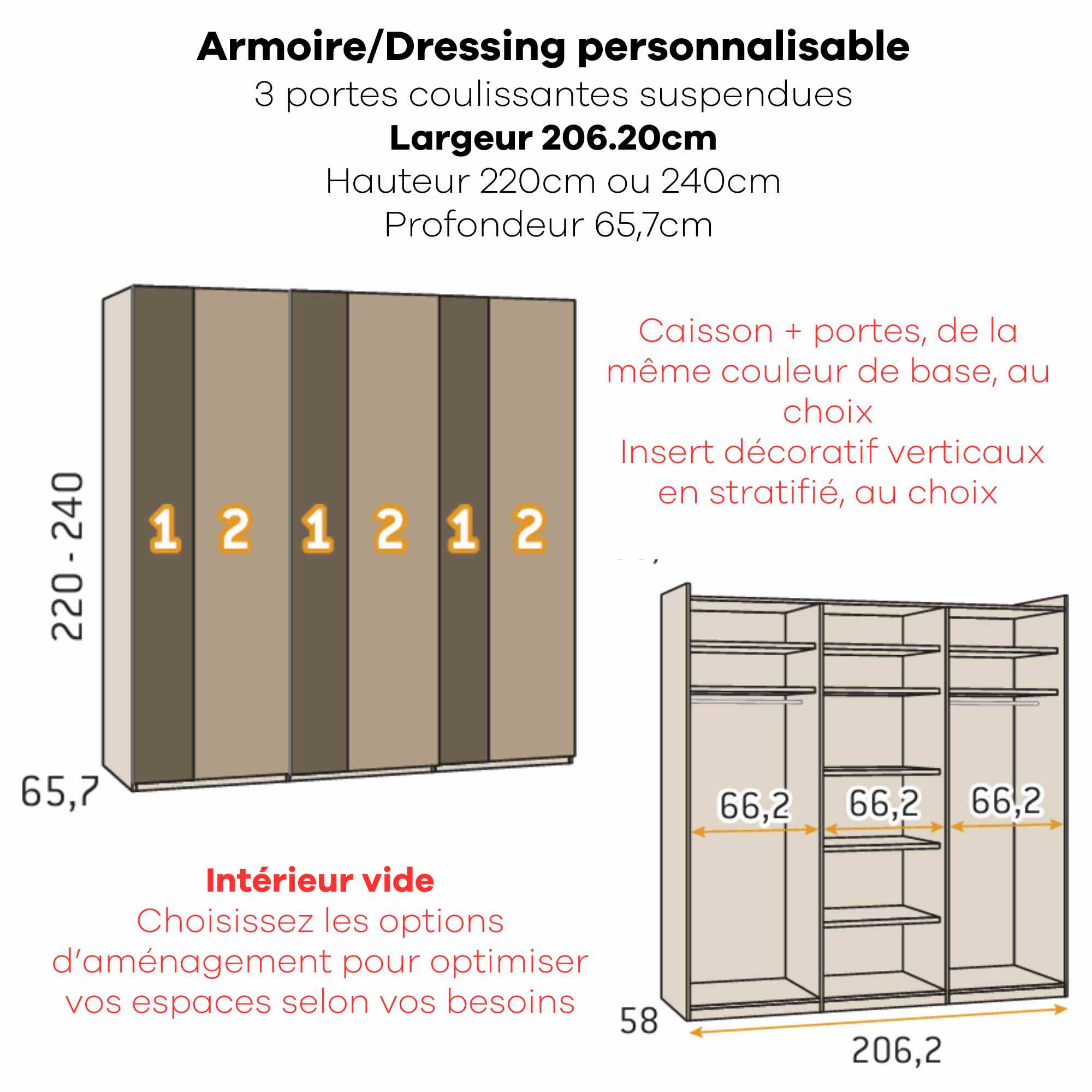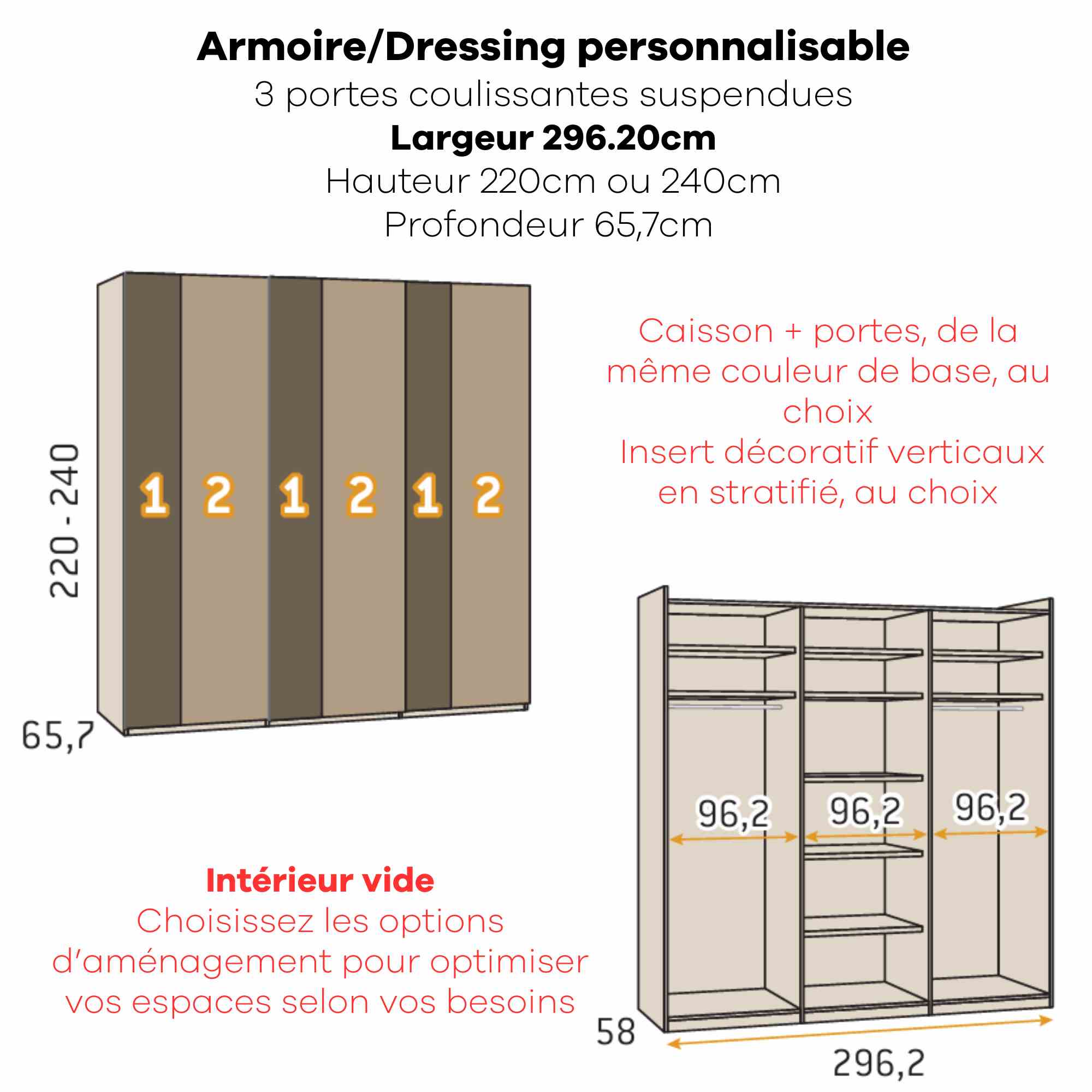 Armoire personnalisable LOLA - 3 portes coulissantes suspendues - Largeur de 206.20cm à 296.20cm - Hauteur 220cm - Profondeur 65.70cm - Inserts décoratifs verticaux