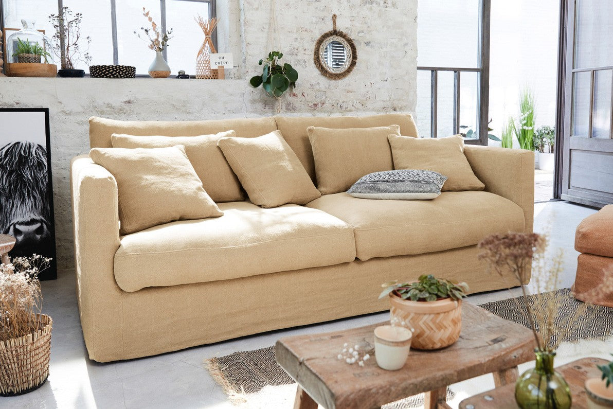 - Le revêtement est proposé en lin froissé, coton/lin ou velours côtelé, avec plus de 200 coloris disponibles. Tous les éléments sont entièrement déhoussables, facilitant l’entretien et permettant de changer de style au fil des saisons. Le canapé Nomad est certifié NF et bénéficie d’une garantie de 3 ans..